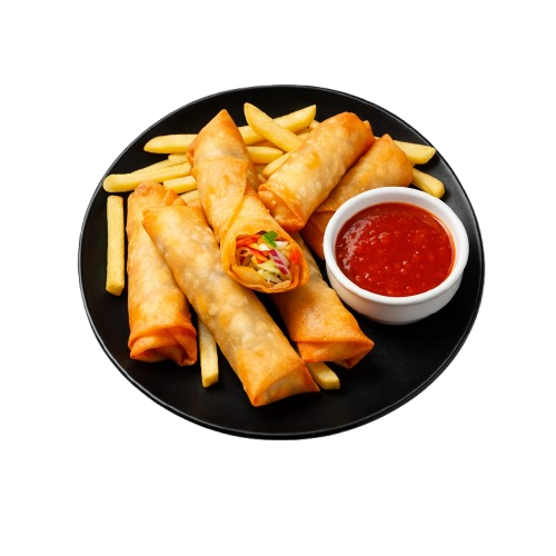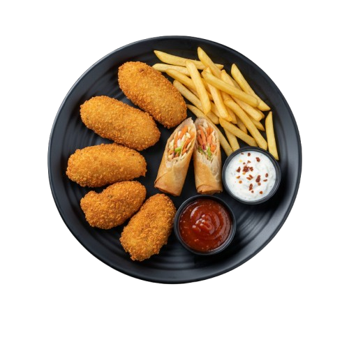 A complete meal with a mix of favourites: Veg Fried (2 pcs) + Veg Kurkure (2 pcs) + Veg Spring Roll + French Fries.